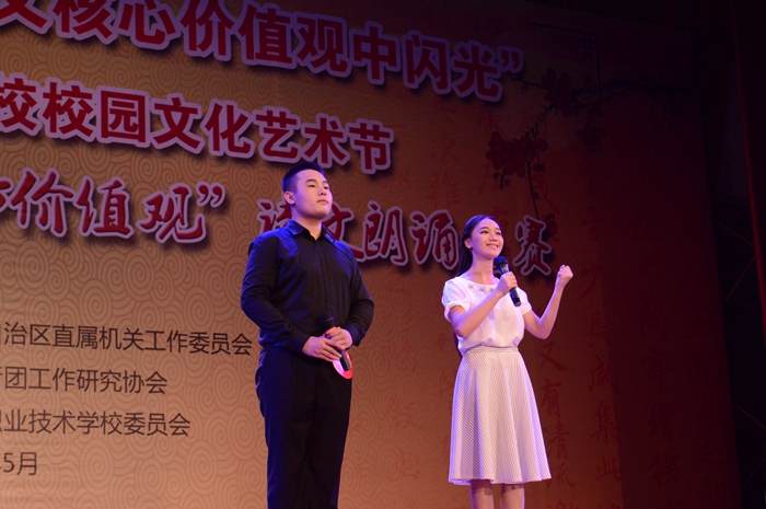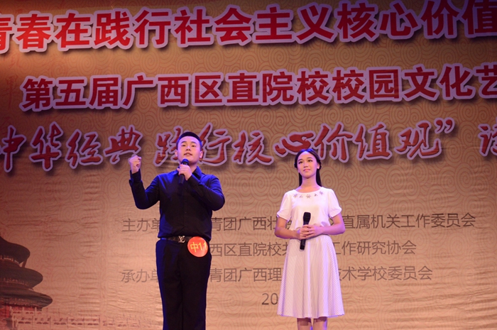 5月16日下午,第五届广西区直院校校园文化艺术节“传诵中华经典,践行核心价值观”诗文朗诵比赛中职组决赛在广西理工职业技术学校风华礼堂进行。参加比赛的共有16个学校的代表队,每支代表队的人数为2~8人。在信息与商务系黄扬飞老师的带领下,14汽车检测技师班的姜文凯及14汽车技术服务与营销的董丽芳两位同学组成了我院代表队参加决赛。